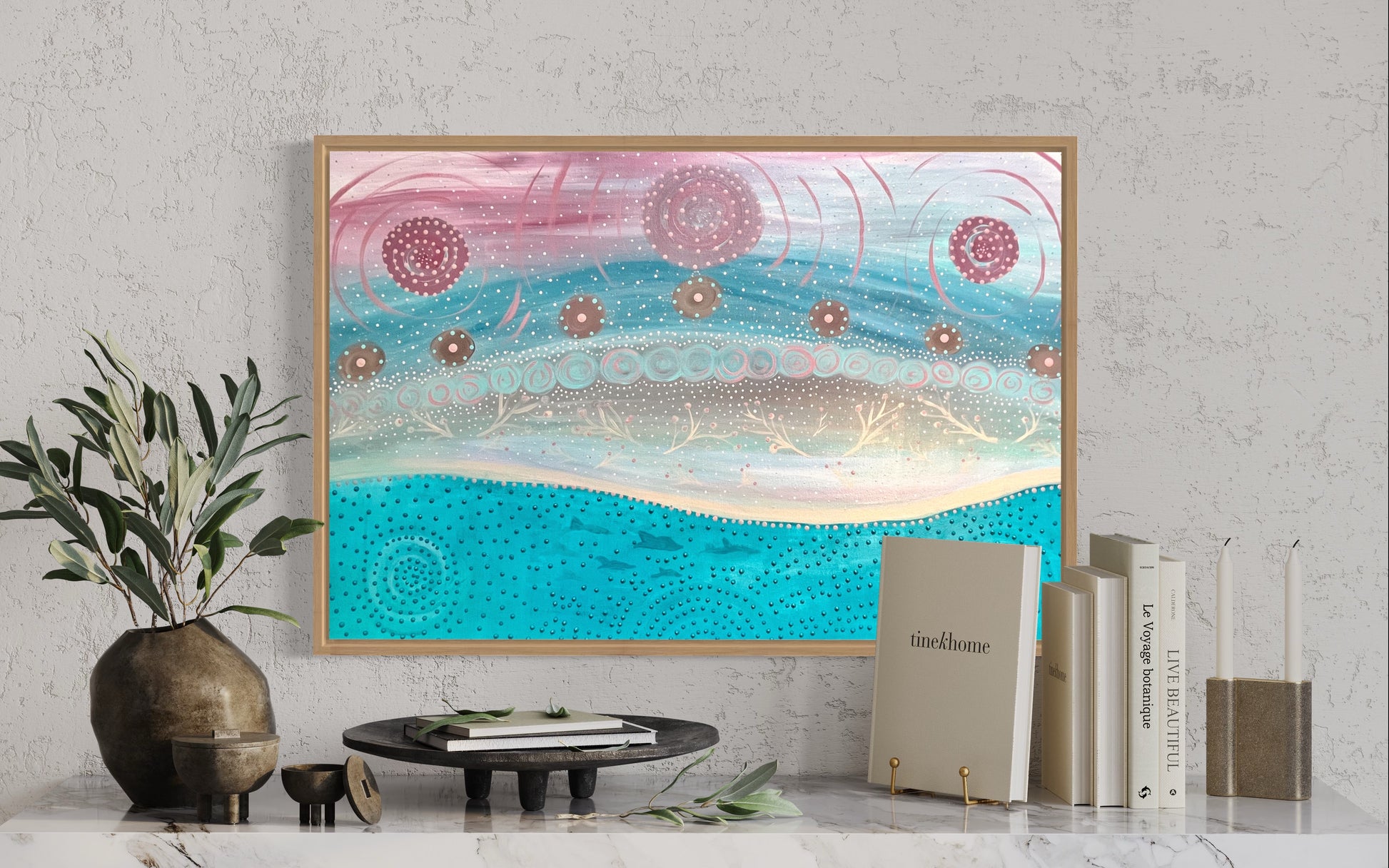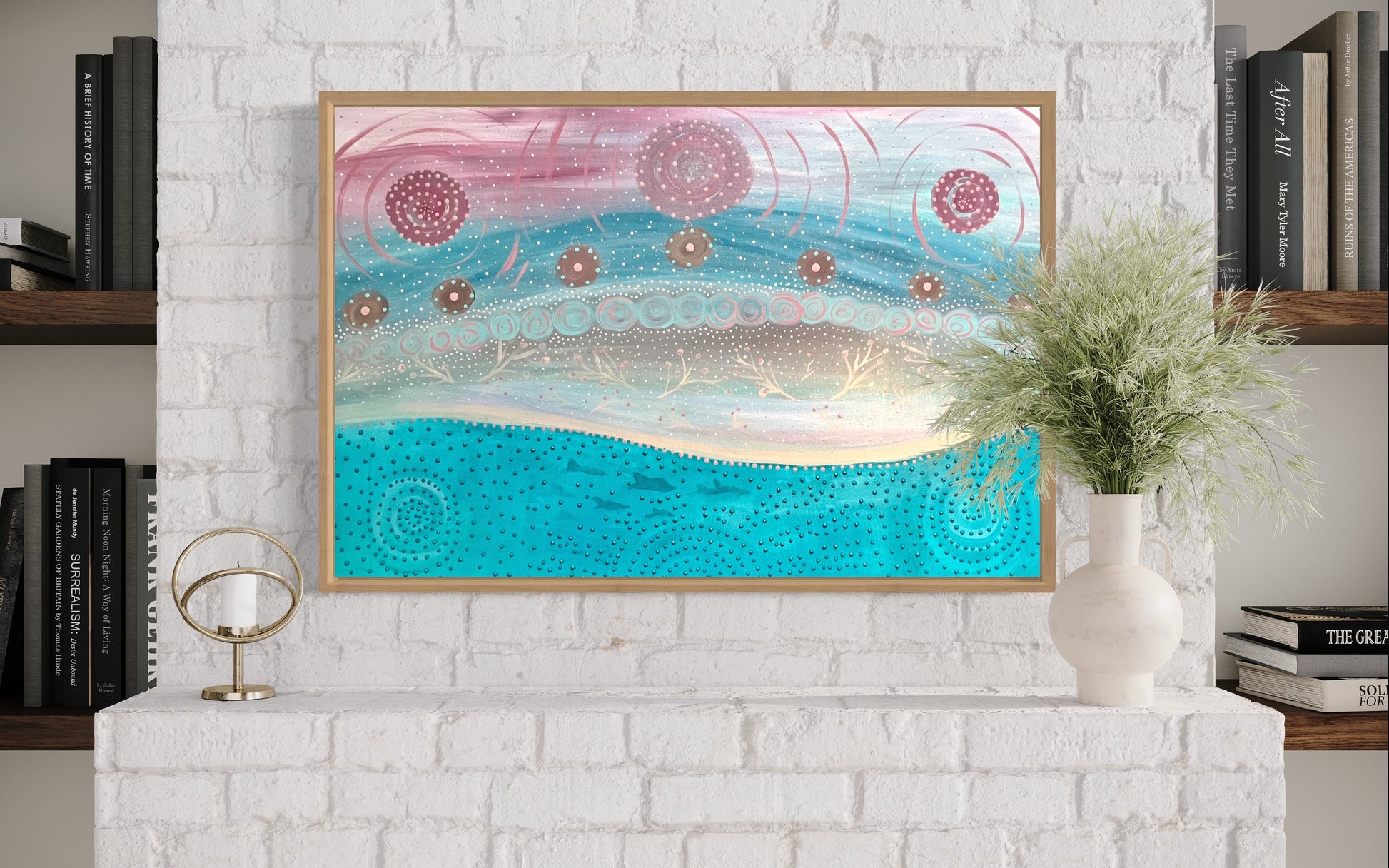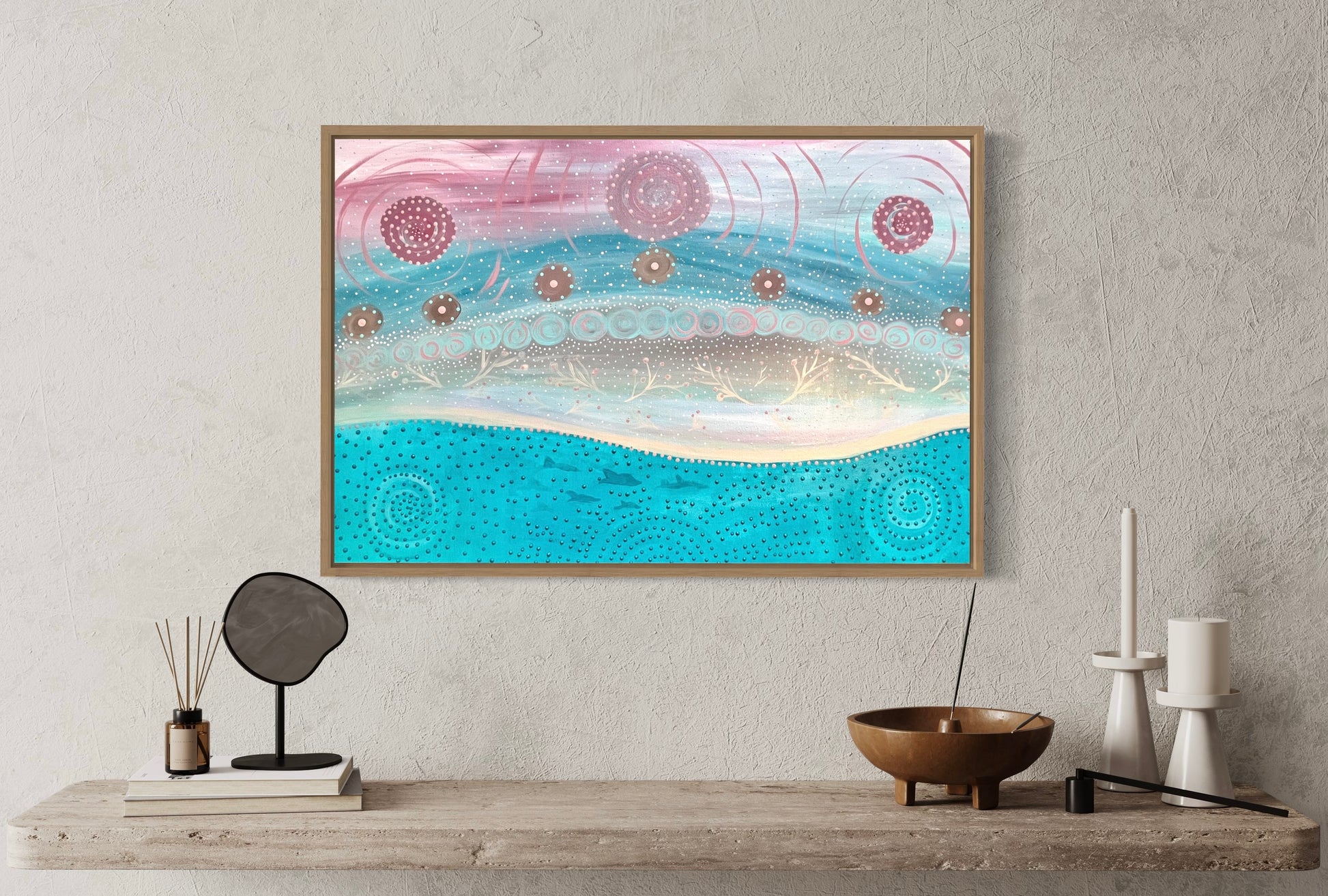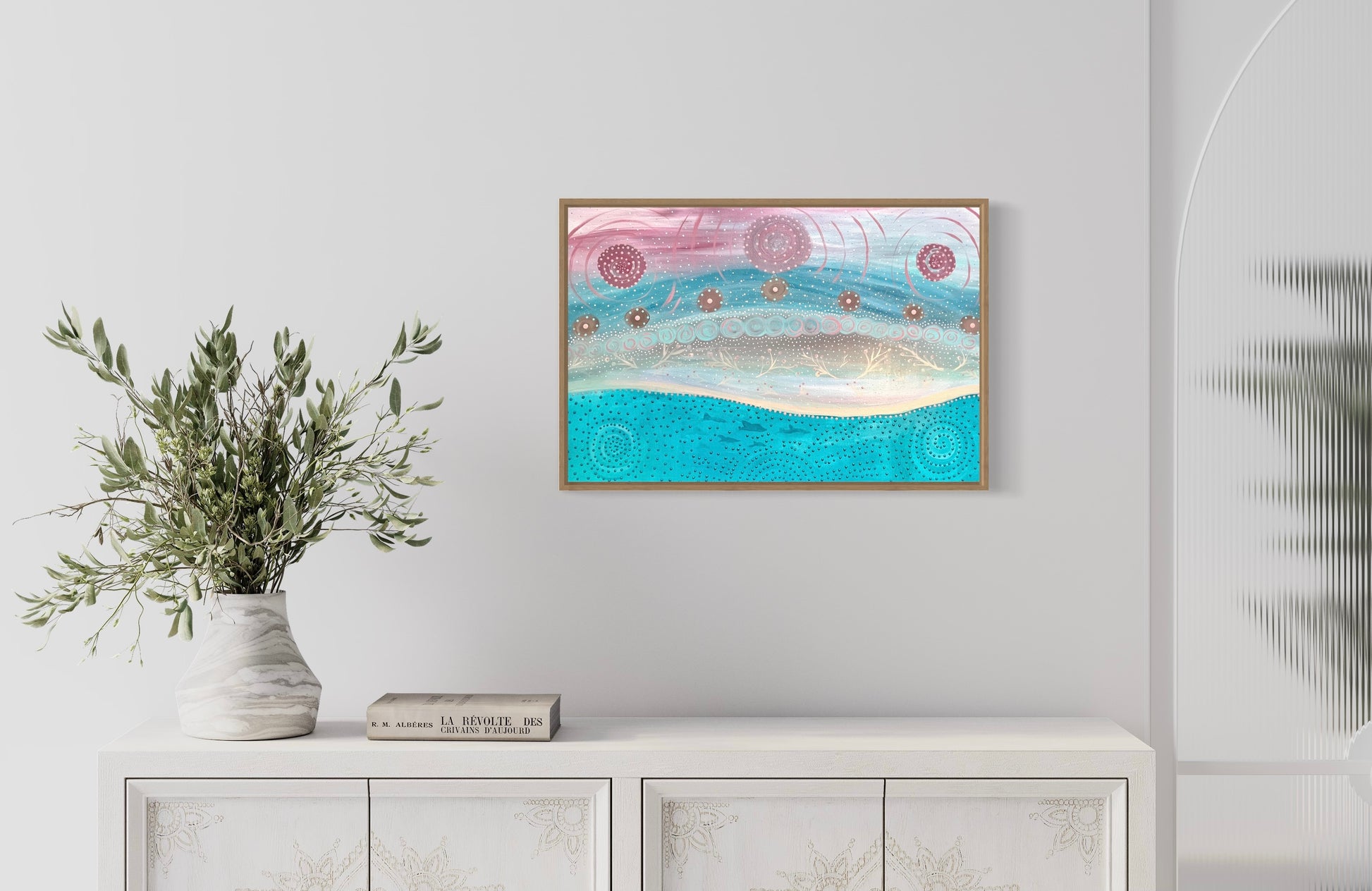This original artwork is a story about harmony. Families, communities and the Divine moving together to create a beautiful place, Amaroo. Healing through connection to Mother Earth, Love and kinship.