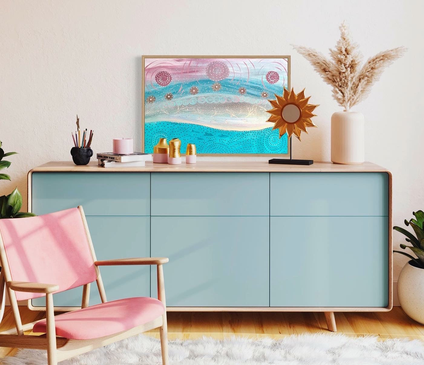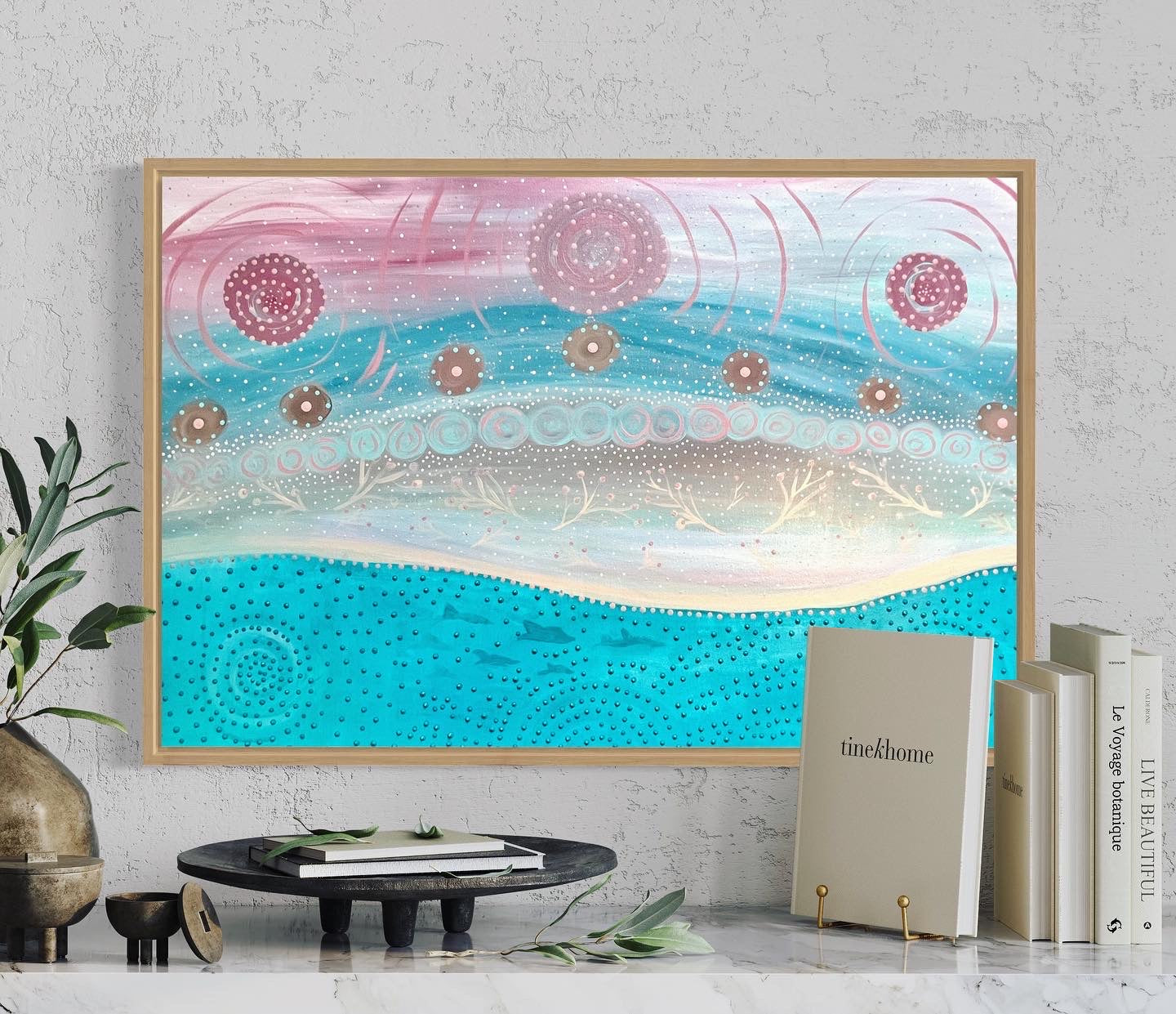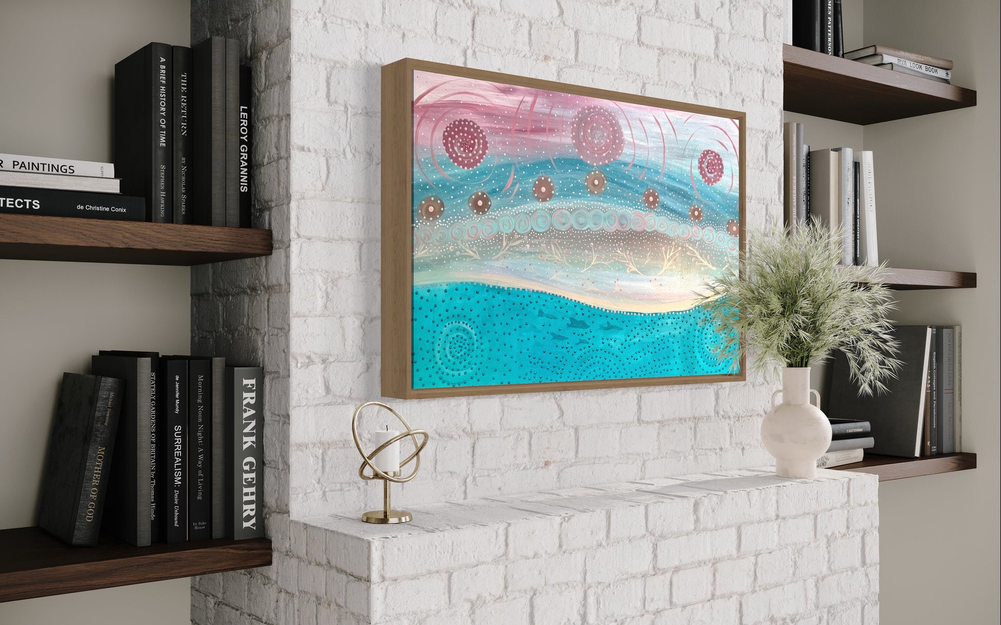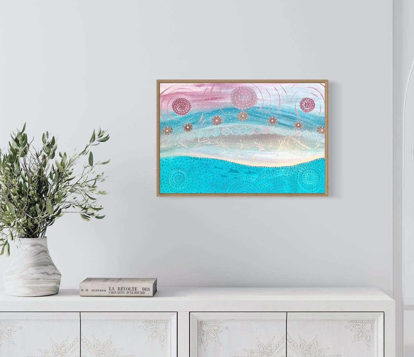 This original artwork is a story about harmony. Families, communities and the Divine moving together to create a beautiful place, Amaroo. Healing through connection to Mother Earth, Love and kinship.