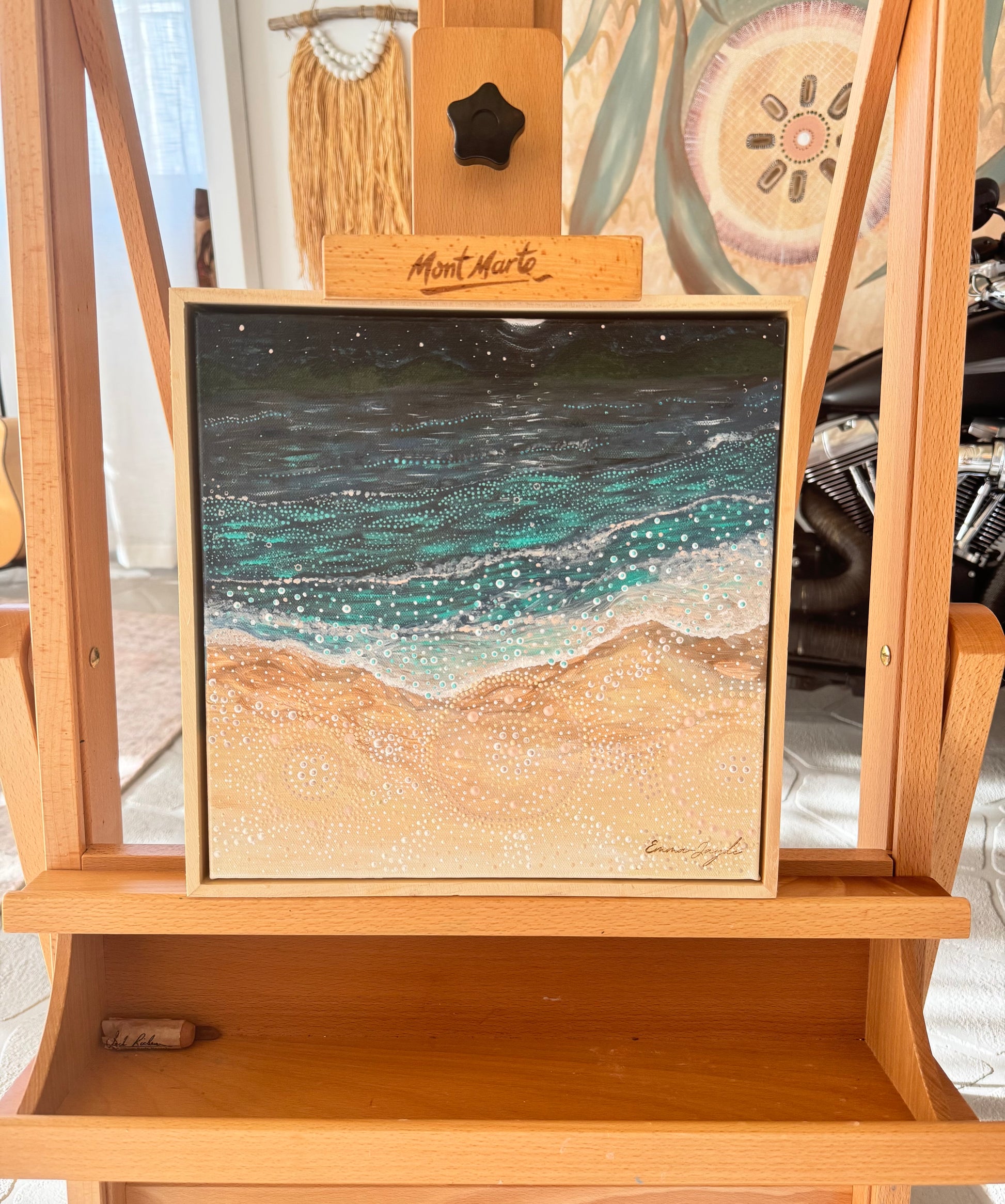 Bioluminesence No.1 is a story about my first visit to Huskisson, 16 or so years ago. I thought it was the moon causing this night light extravaganza amongst the waves at the time, but have come to learn that a certain algae houses a cellular being that journeys through the ocean, generating light from within. The timing of my first visit and being a witness to this display, I now know to be rare. The Ocean sang to me that night and the song line drew me to this place I now call home. Aboriginal people are travellers, moving around for the purpose of survival, spirituality and meaning. This painting is about that journey, a journey we refer to as 'walkabout'. All these years later and I am still appreciating the precious land that sang to me that night.♥️