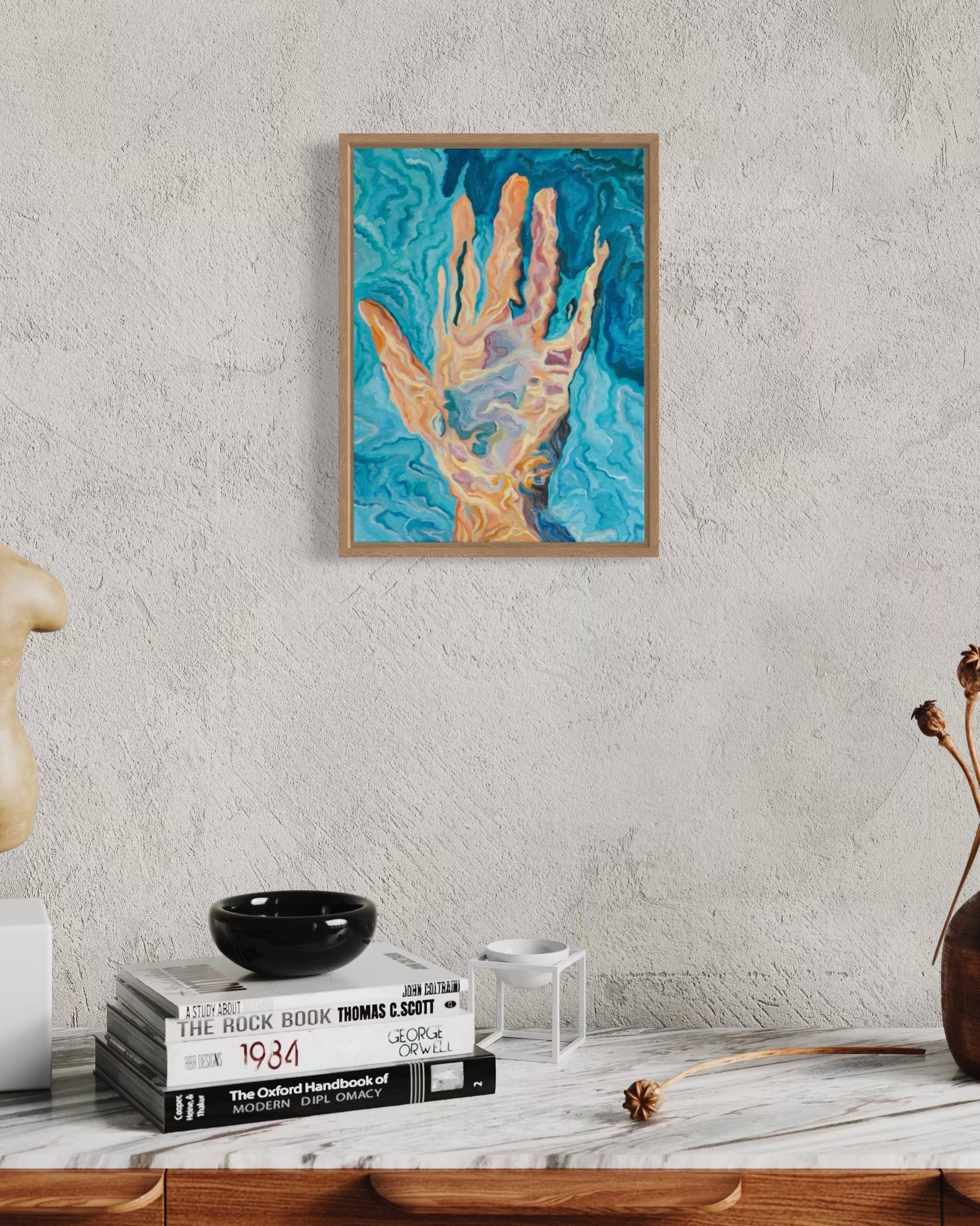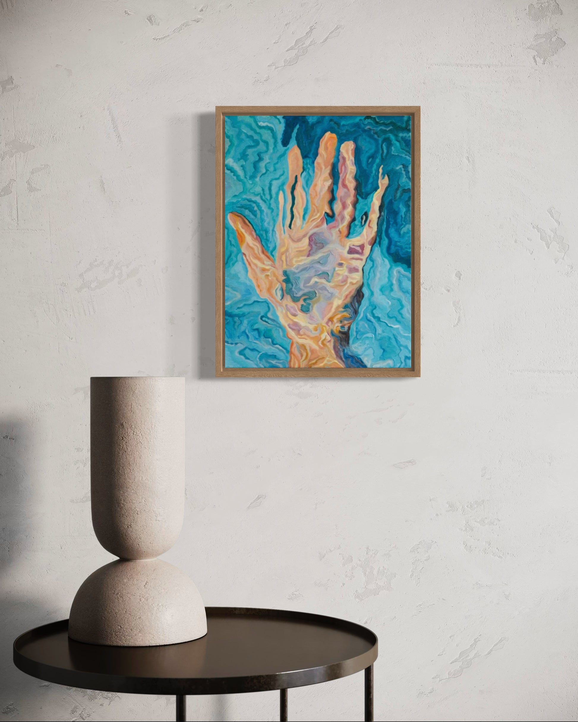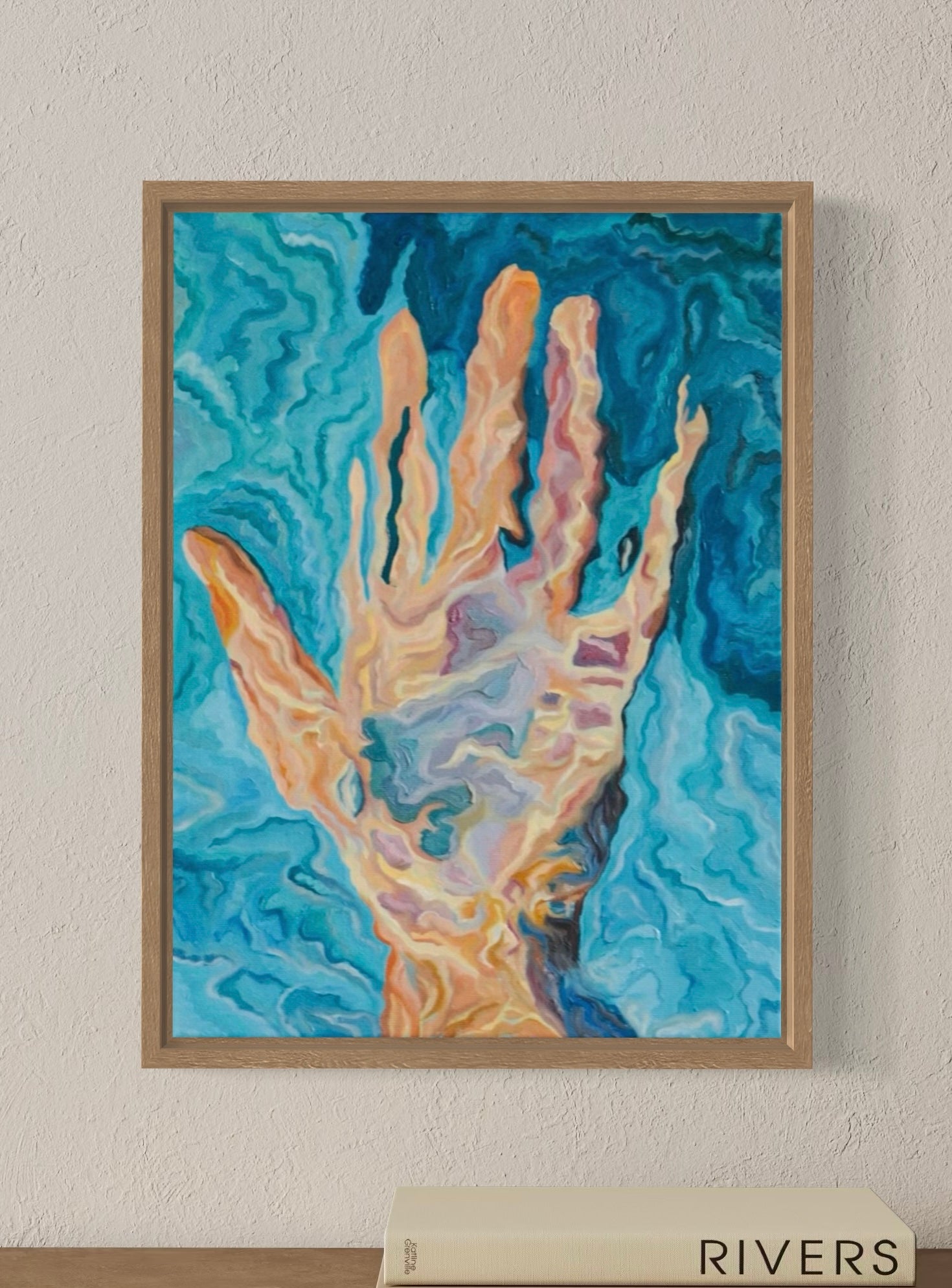 Second release of Kathini collection. Holding water is an original oil painting representing a hand holding up water. This painting was created with a technique that focuses on use of small wave like brushstrokes and no straight lines.