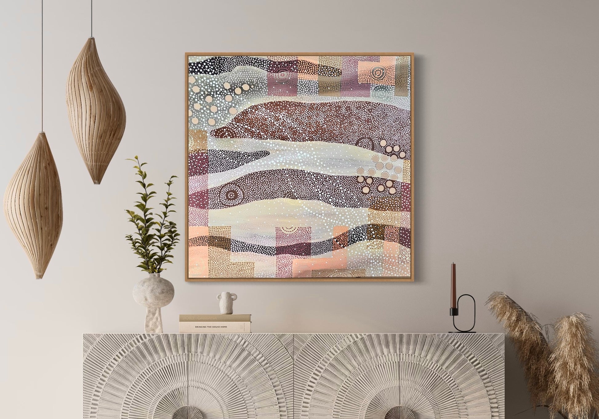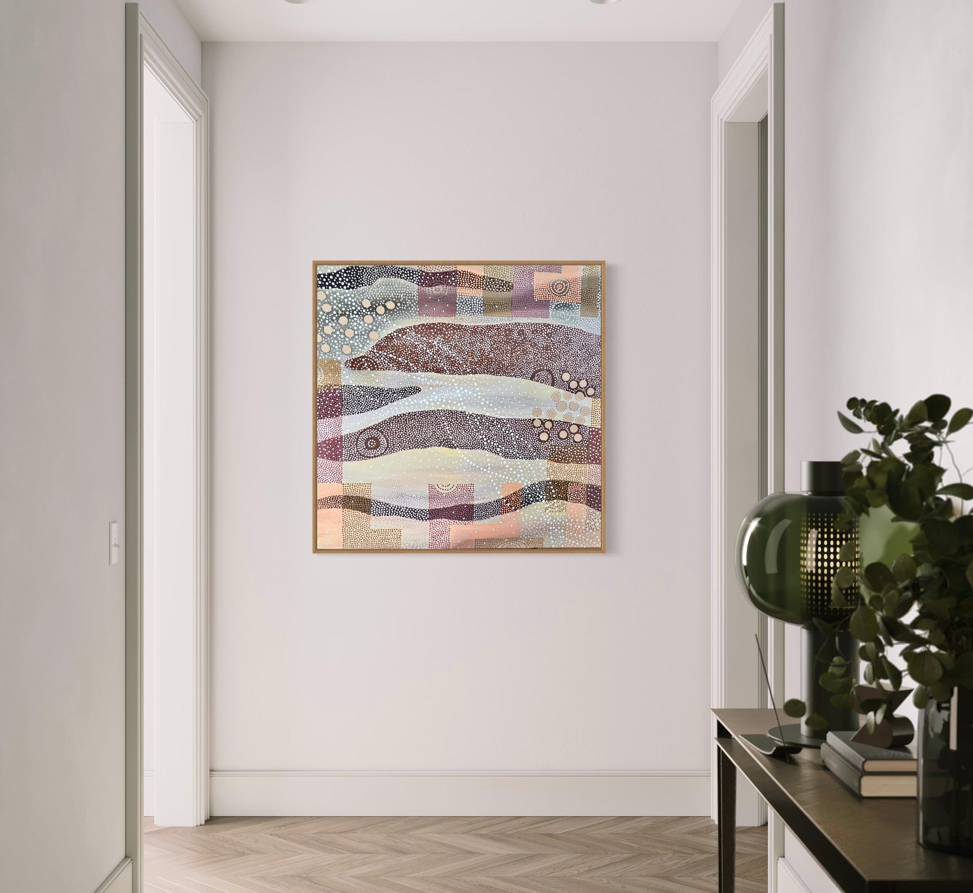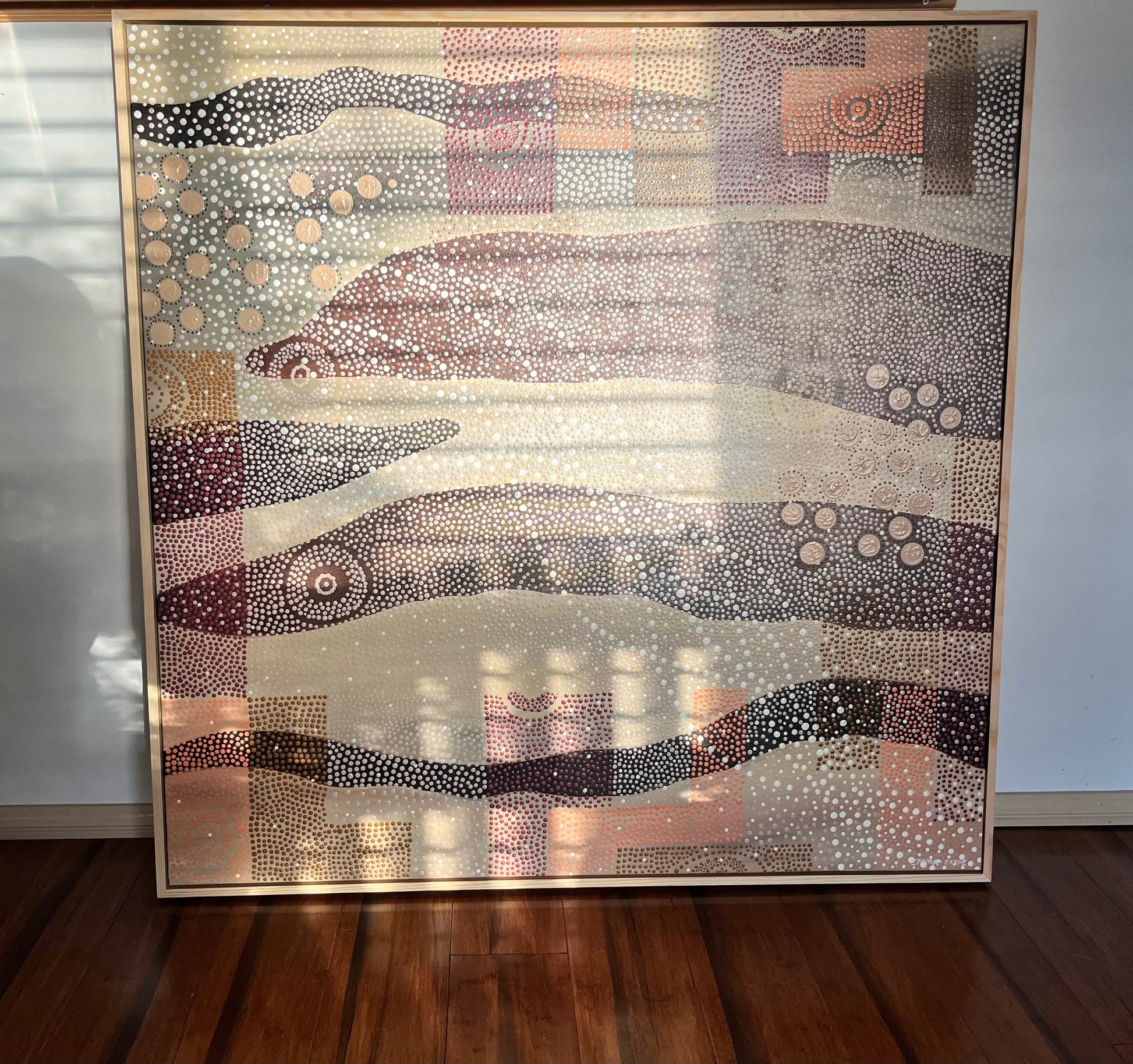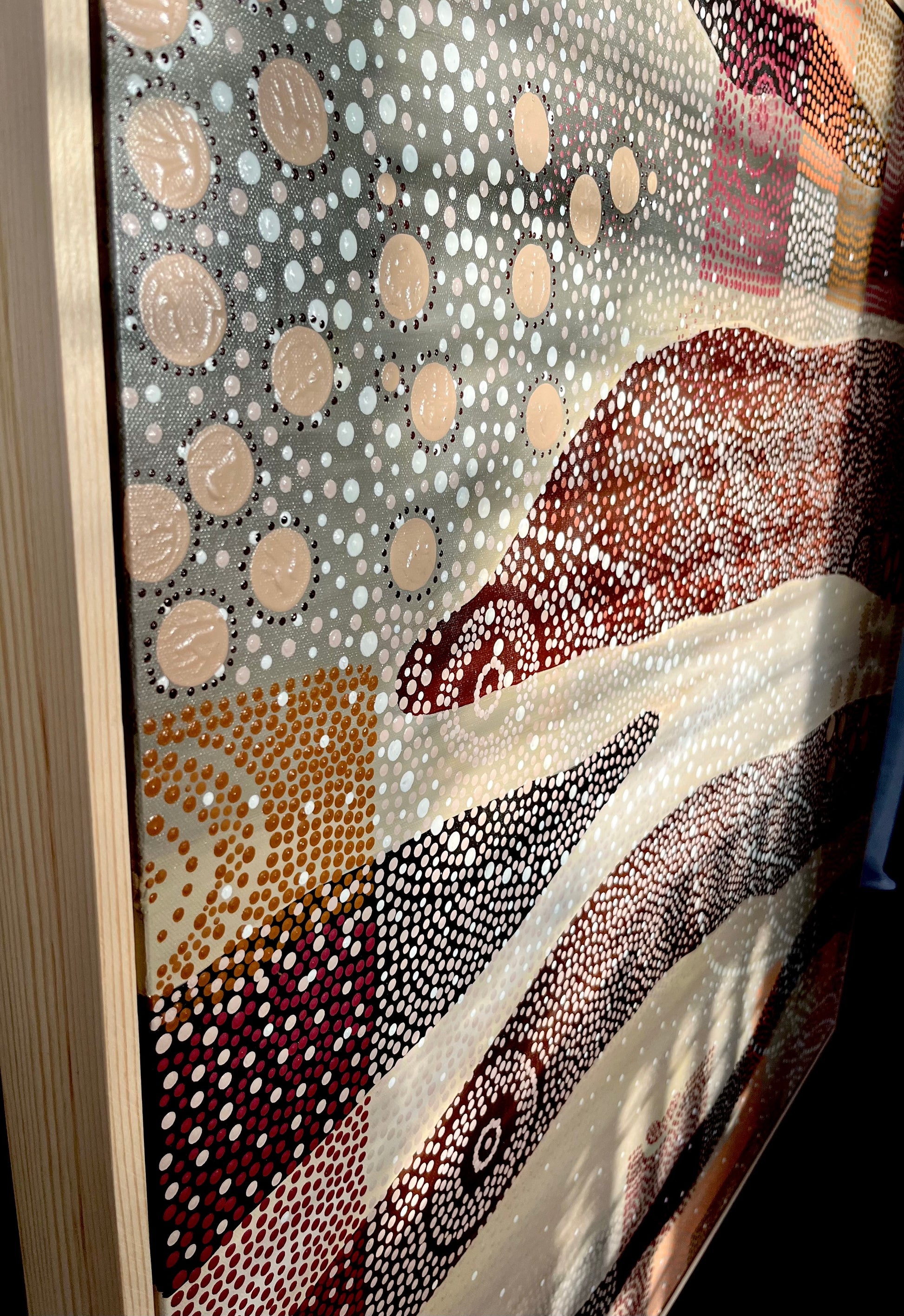 An abstract interpretation of the Mallee from the sky. Songlines of my mob, the Mutti Mutti people. Inspired by the element of wood and Earth. This original piece is an offering of the magic of the Mallee, the clear skies of this expansive landscape and the changes our Songlines have gone through during my ngapungai (grandmother's) generation, my mothers generation, and my generation.