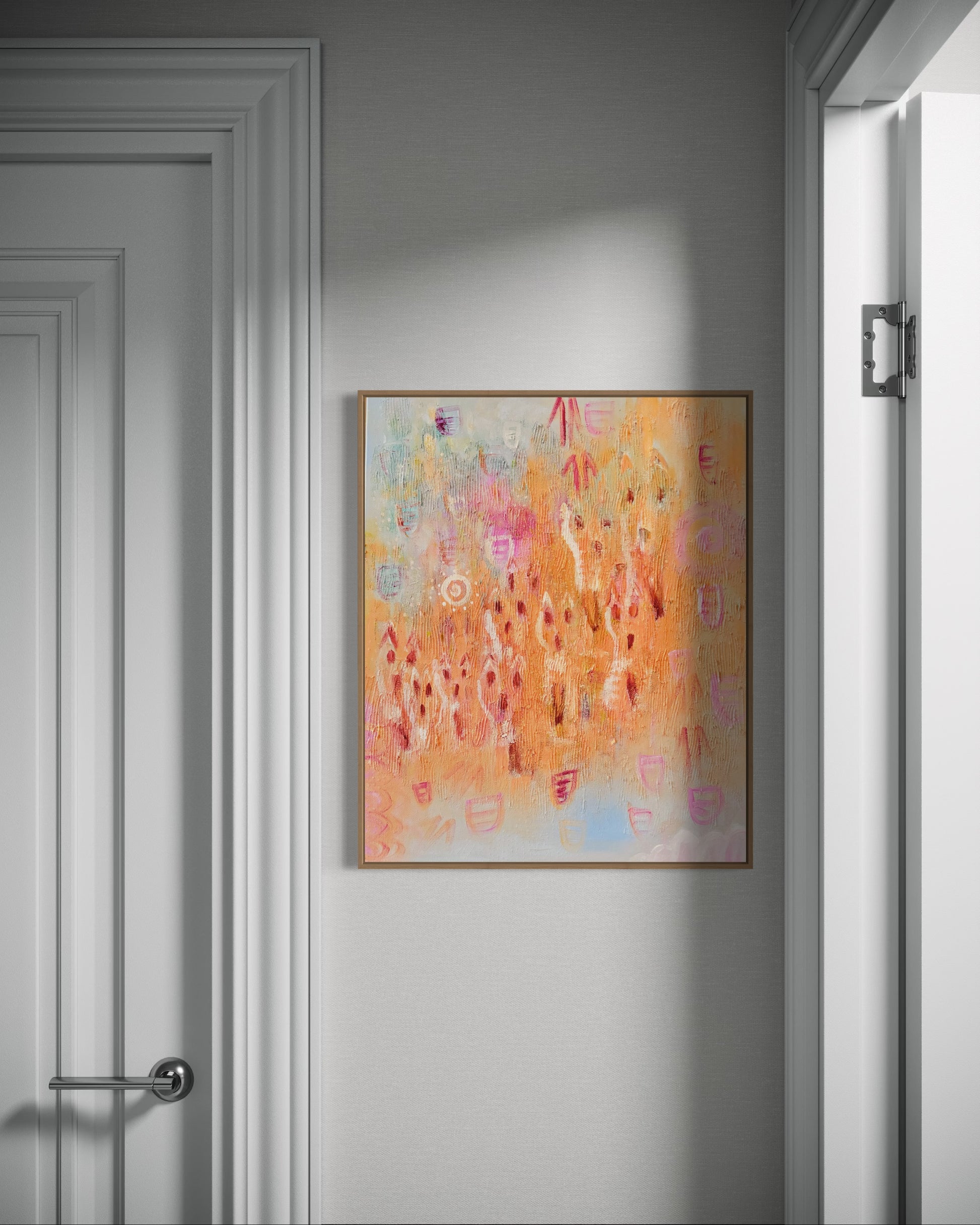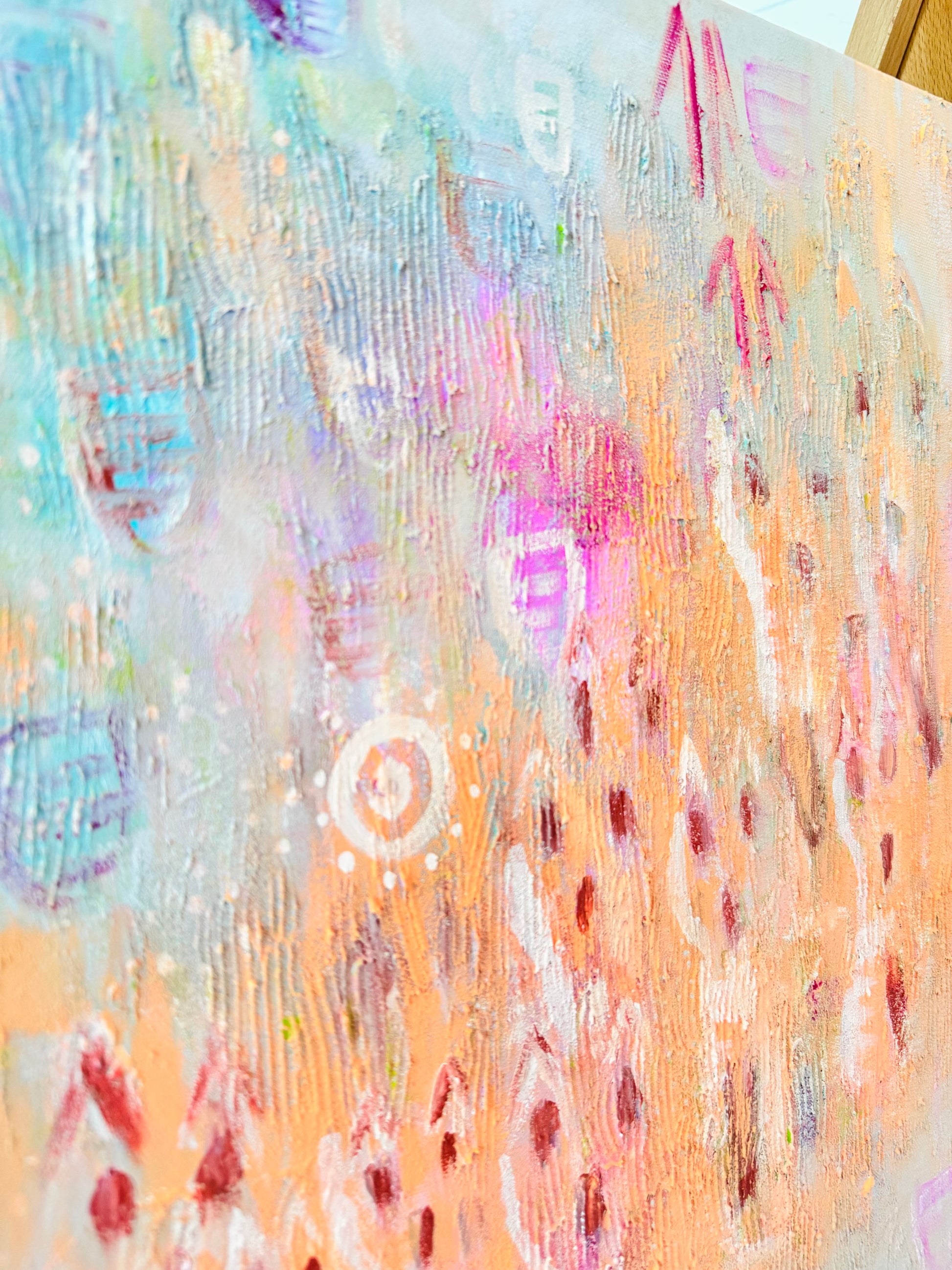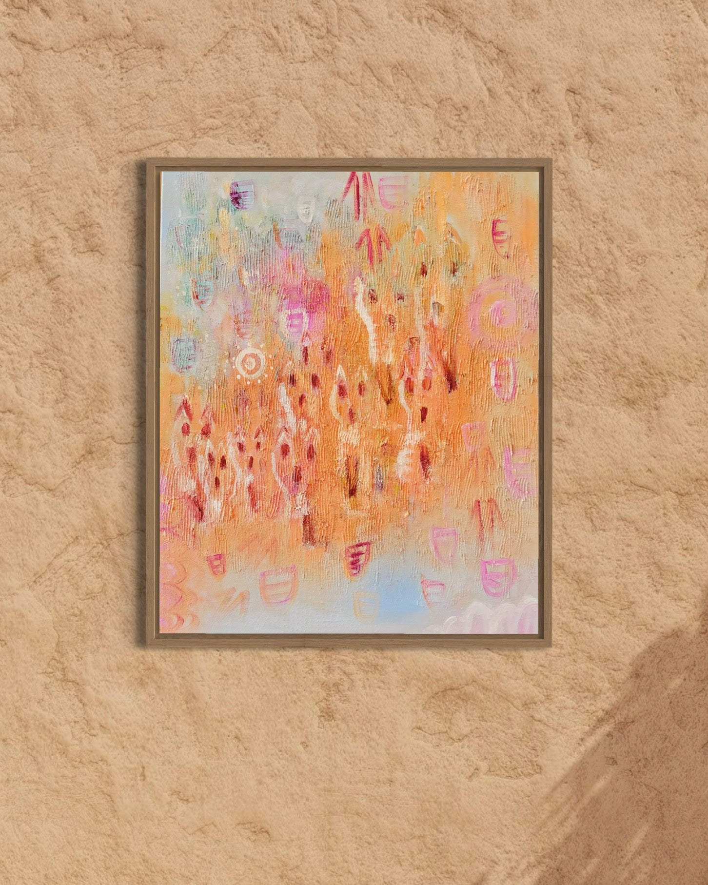 Her mob follows—elders, mothers, joeys—painting their own rhythms beside hers. Together, they map a story of kinship, of shared breath and belonging.