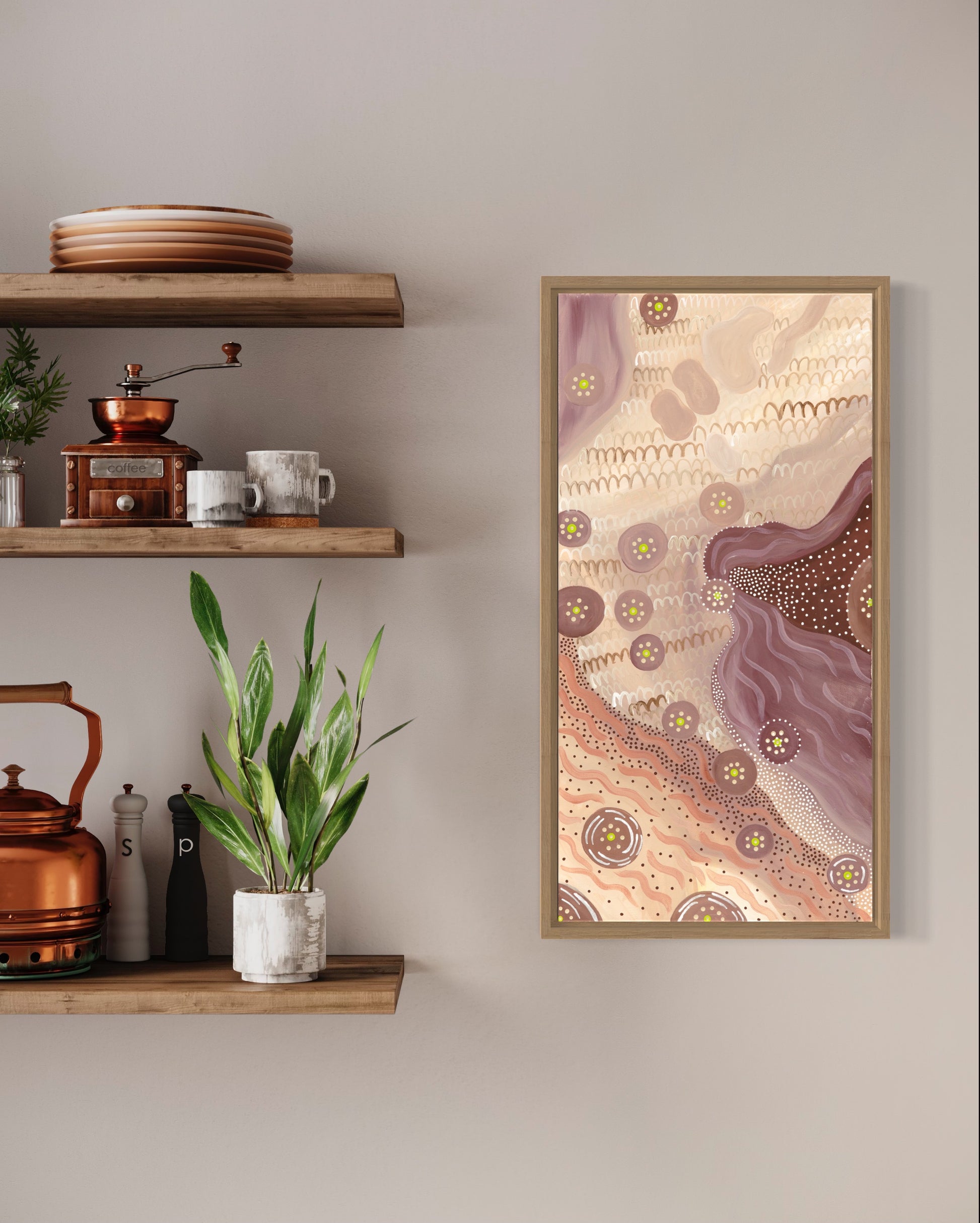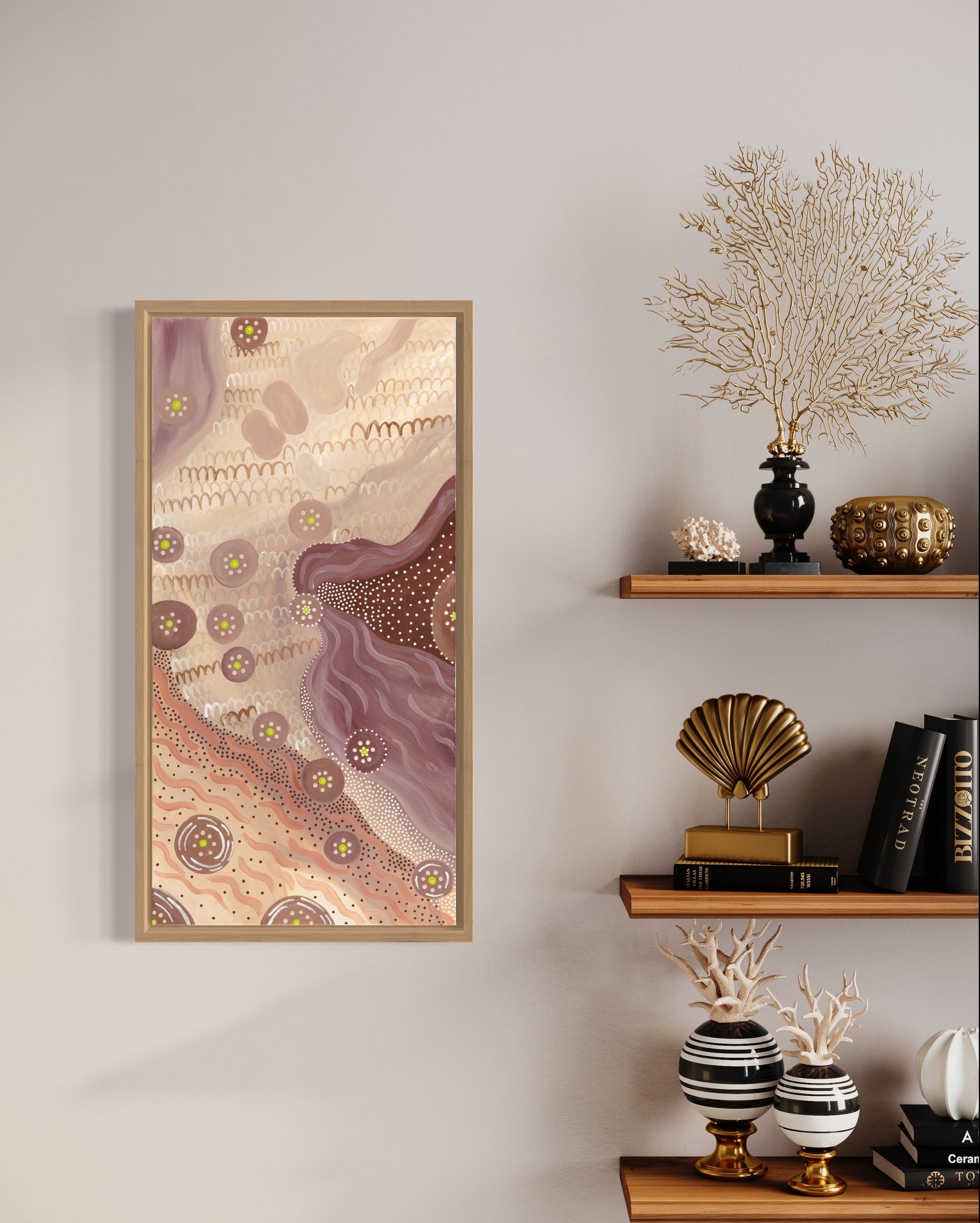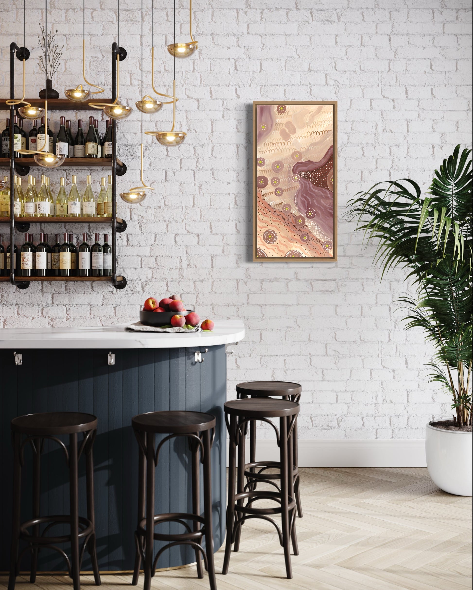 This painting is my depiction of my tribal languages country around the southern part of NSW, border of Victoria. This map features the Lachlan river, Murrrumbidgee river, the Murray river and Mungo, an ancient and sacred site. Aboriginal people did not just settle in one area, and often move about depending on the season, where the waterways flowed and meetings of the tribes. This map is an abstract version of my connection to the land in these areas and represents how our languages connect to the river country.
