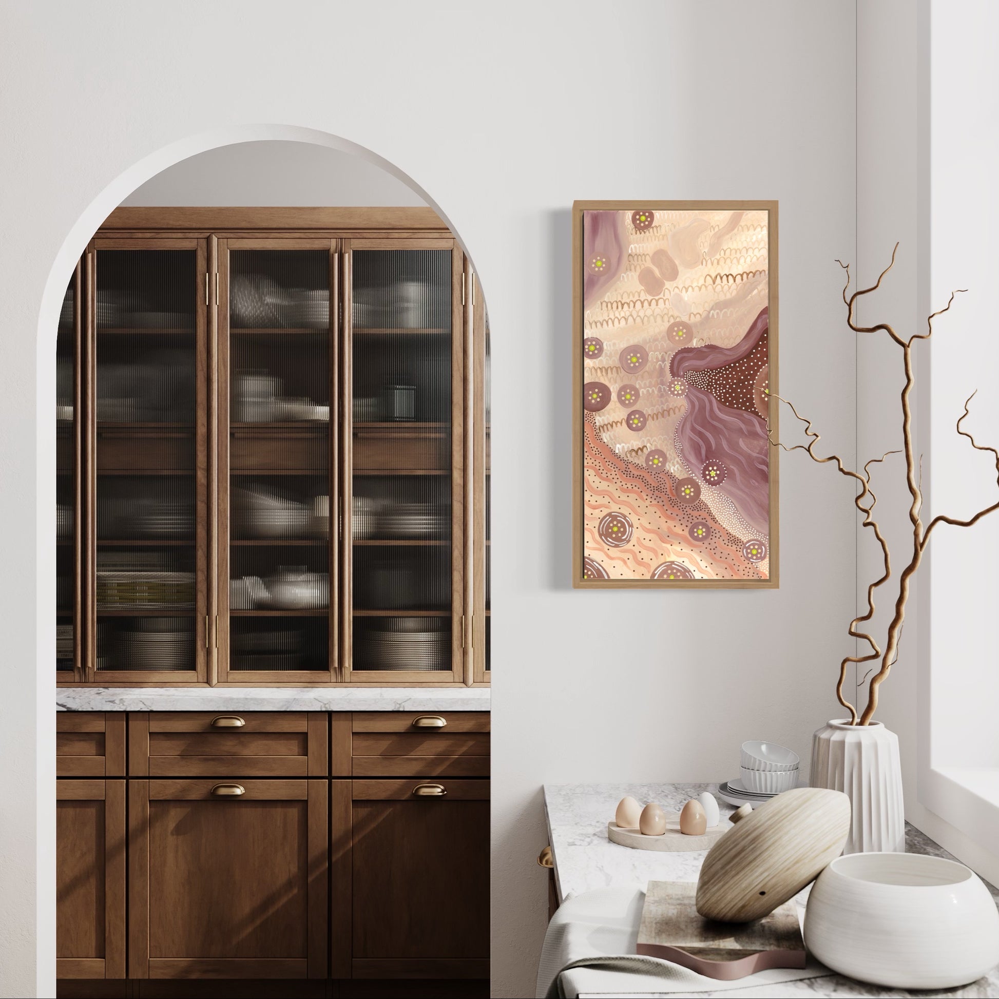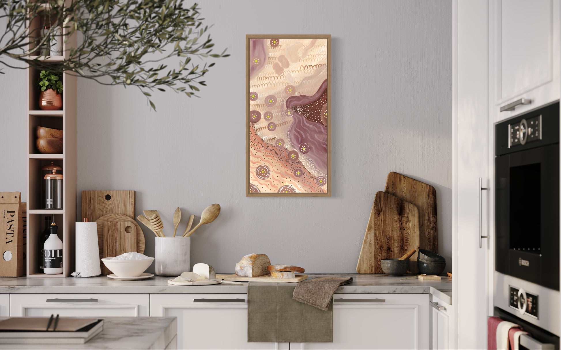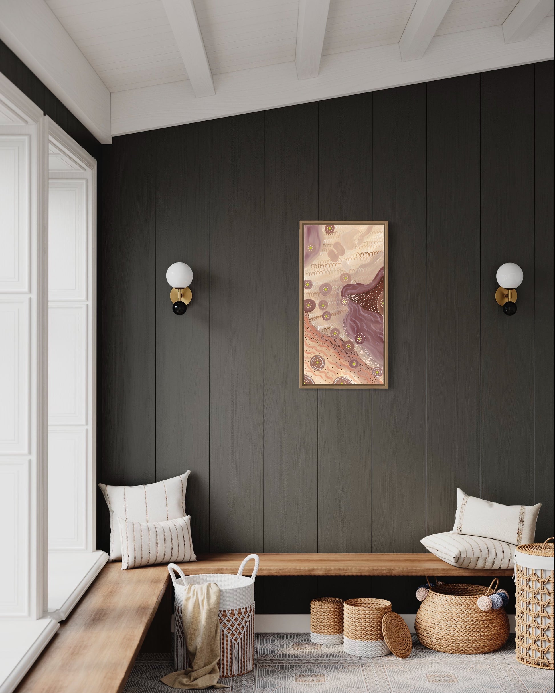 This painting is my depiction of my tribal languages country around the southern part of NSW, border of Victoria. This map features the Lachlan river, Murrrumbidgee river, the Murray river and Mungo, an ancient and sacred site. Aboriginal people did not just settle in one area, and often move about depending on the season, where the waterways flowed and meetings of the tribes. This map is an abstract version of my connection to the land in these areas and represents how our languages connect to the river country.